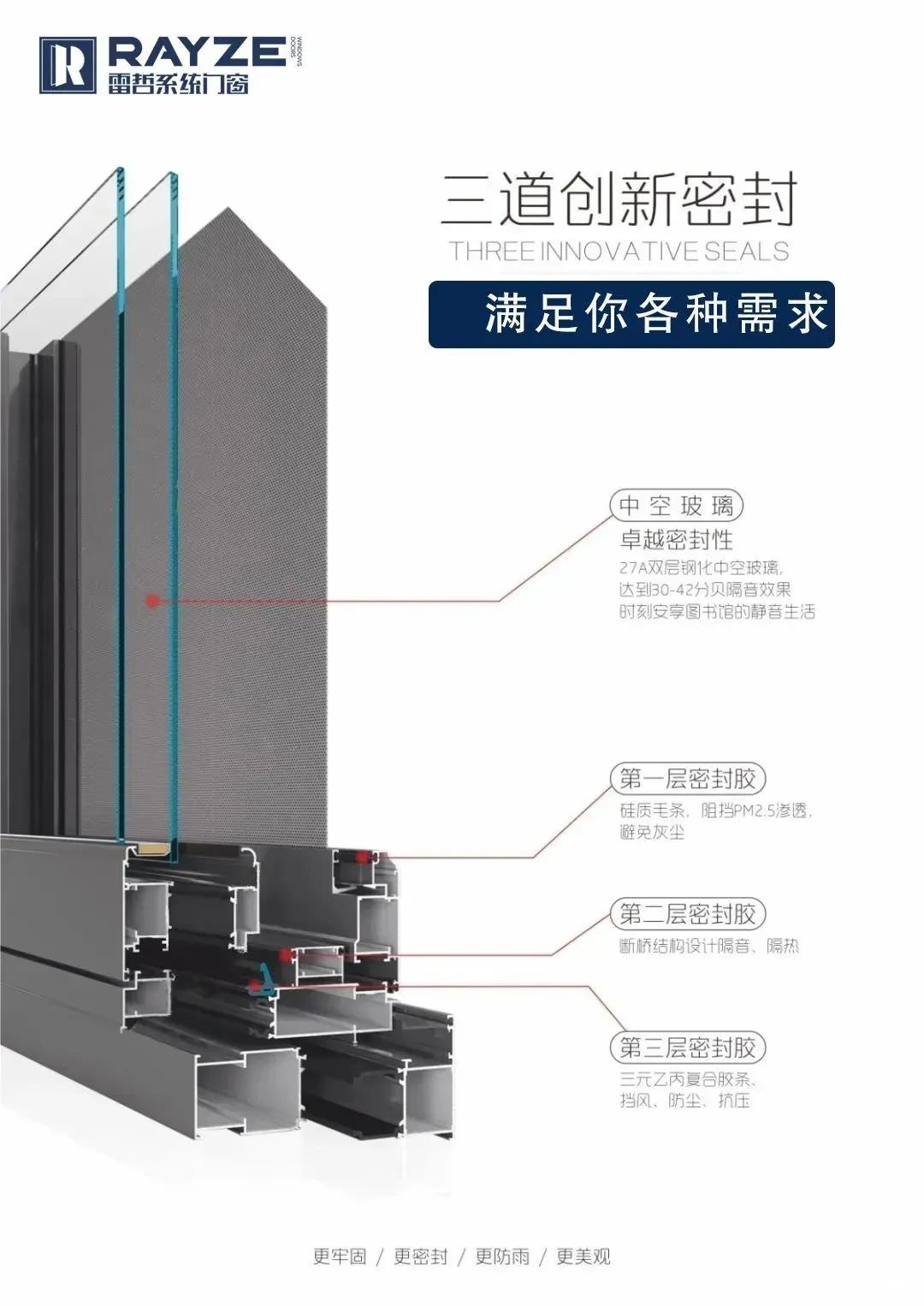密封膠條是決定門窗密封性能的重要因素,質量不好的膠條耐候性差,經太陽長期暴曬后,容易老化僵硬,失去彈性,容易脫落,不僅密封性差,還會造成安全隱患。雷哲系統門窗采用多層密封設計,選用優質耐用的江陰海達發泡膠條,增強窗戶整體的保溫密封性能,有效阻止室外寒冷空氣滲進室內。