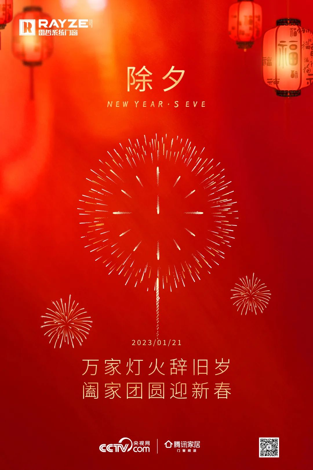 雷哲系統門窗祝大家除夕快樂,爆竹聲中一歲除,春風送暖入屠蘇,千門萬戶曈曈日,總把新桃換舊符,除夕轉瞬到眼前,雷哲系統門窗給各位拜早年:2023年風風火火招財年,順順利利如意年!