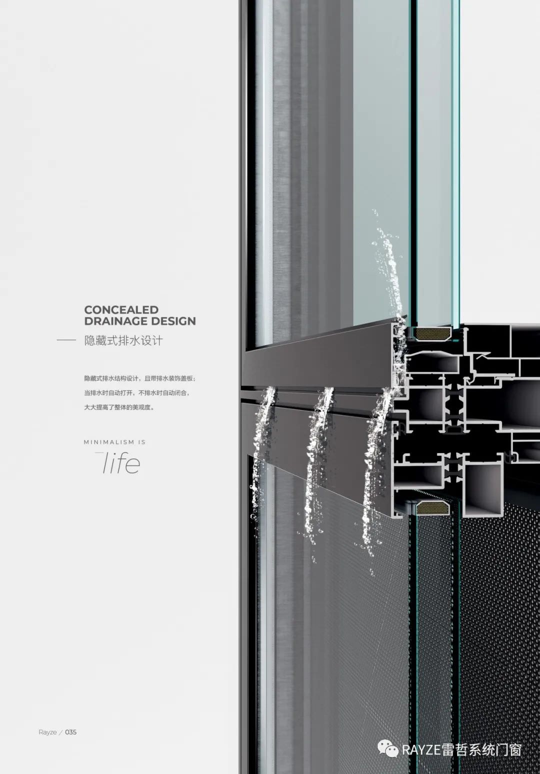 雷哲系統門窗經過深入研究,多次反復試驗,最終取得革命性突破,創新排水方式,采用隱藏式排水。與傳統排水方式相比,隱藏式具有明顯的優勢。隱藏式排水孔改為垂直向下,水受垂直向下的重力排出,排出壓力大幅提高。此外,雨水可以沿整個排水孔排出,比原來橫向排水時的排出面積更大。也就是說,垂直向下排水更快,流量更多、更加順暢,從而避免堵水。